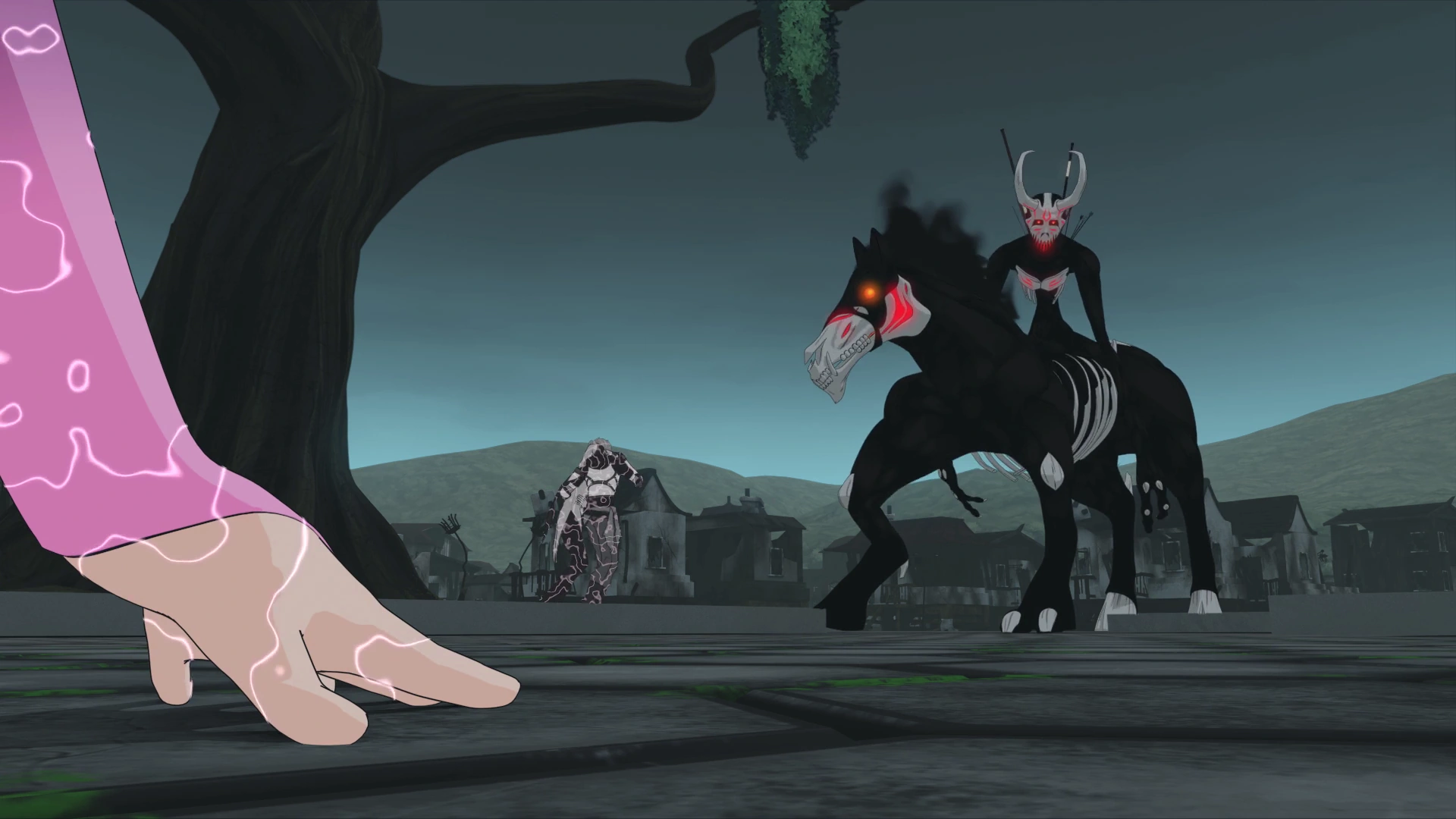 Terrified and crying himself, Ren discovers his Semblance—basically an X-Men power—which calms his panic and makes the Grimm ignore him. Gathering his courage, he sprints across an open space to join Nora, telling her to be brave. She tackles him in the first of what will be many hugs, and after a surprised moment, Ren returns the hug and his Semblance activates, calming both of them. The Nevermore flaps away and the Nuckelavee stalks past their hiding place, its arms dragging unnaturally along the ground, but doesn't discover them. Nora admits her fear to Ren, who tells her he's frightened too. He ventures out of hiding briefly to retrieve a wooden toy mallet that he gives to Nora, telling her they'll keep each other safe, and the two exchange introductions.]