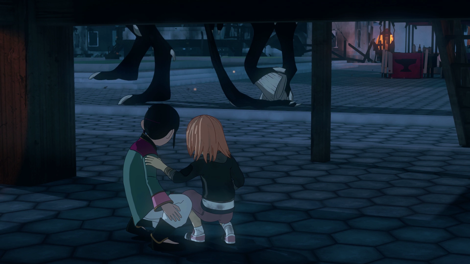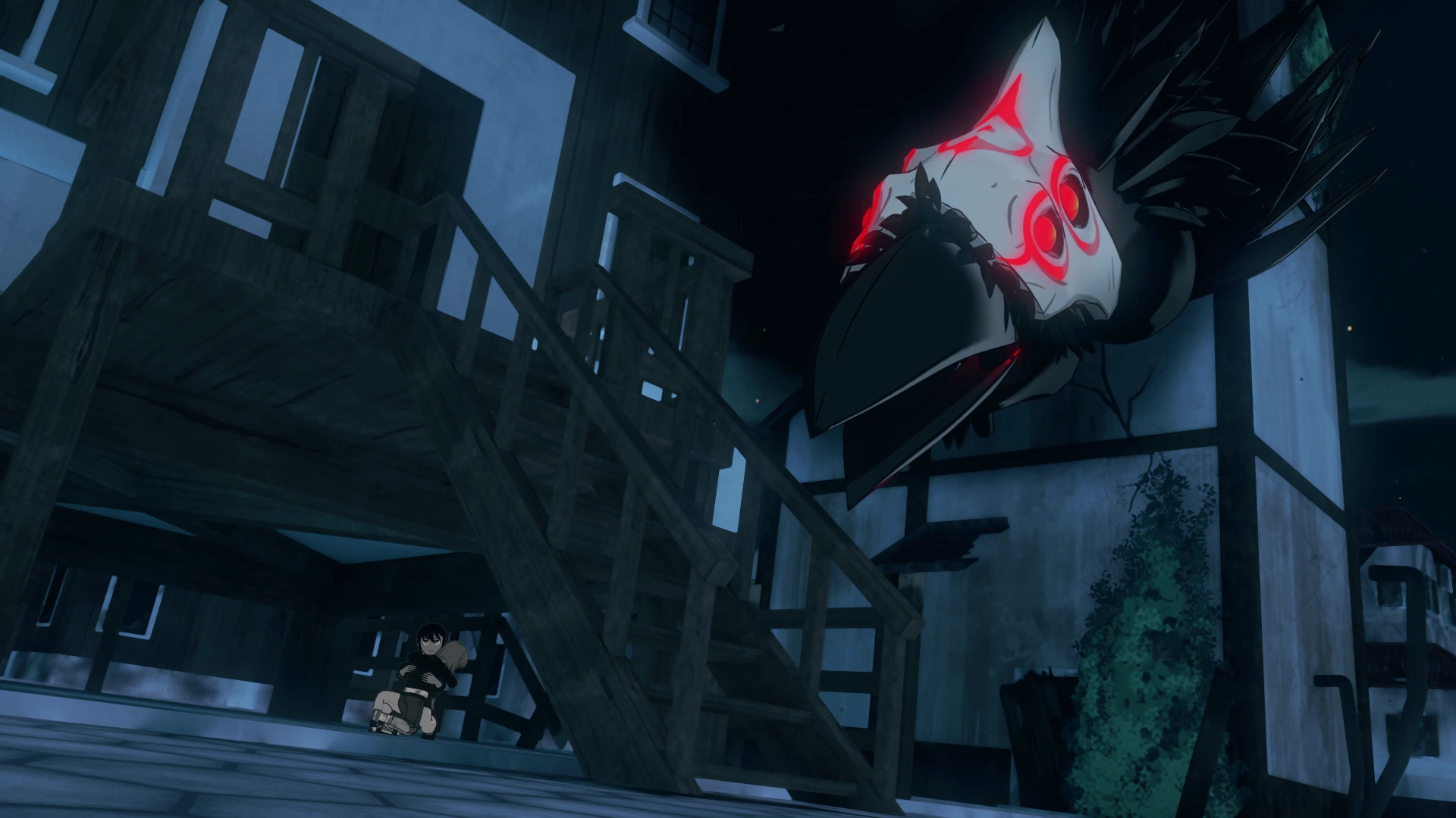 [He sees Nora, who's curled up under a house and crying in terror. A giant raven-like Grimm lands on the roof of the house, presumably drawn to her fear.